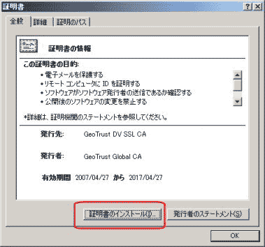 3. ファイルをダブルクリックし、証明書の情報画面を表示させます。「証明書のインストール」ボタンをクリックします。