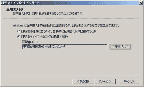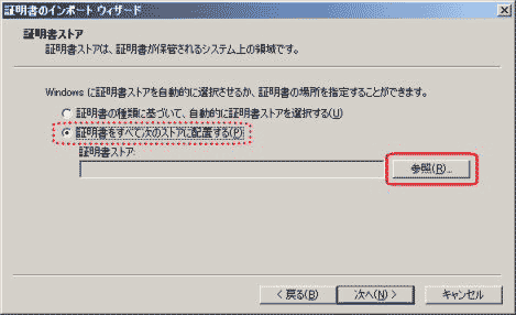 5. 証明書ストアの選択画面が表示されます。「証明書をすべて次の..」をクリックして「参照」をクリックします。
