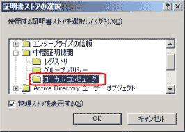 6. 証明書ストアの選択画面が表示されます。「物理ストアを表示する」のチェックボックスをオンにし、「中間証明機関」の下の「ローカルコンピュータ」を選択します。