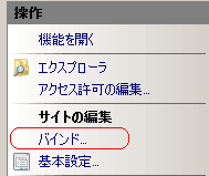 1. 「インターネットインフォメーションサービス(IIS)マネージャ」画面に戻り、SSLを有効にするサイトを選択して[操作]メニューの[バインド]を選択します。