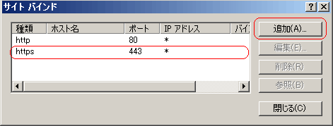 初めてSSLを設定する場合は[追加]を、更新の場合は既にhttpsのバインド設定が存在しますので、それを選択して[編集]をクリックします。