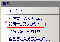 3. 右側の操作メニューから、[証明書の要求の完了…]をクリックします。