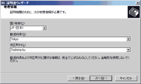 注意!「wwwあり」と「wwwなし」は、別ドメインの扱い - Country(国名)、State(都道府県名)、Locality(市区町村名)を入力し、[次へ]をクリックします。Locality(市区町村名)は、都道府県の1つ下のレベルのみ