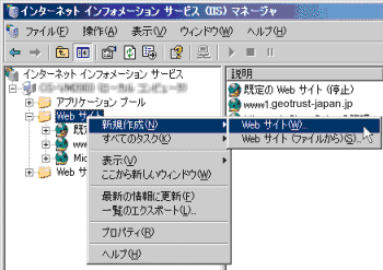 - [Webサイト]を右クリックし、[新規作成]→[Webサイト]をクリックします。Webサイト作成ウィザードが起動します。