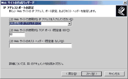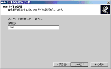 「説明」枠に仮想サイトの名前として、任意の判別文字列を入力し、[次へ]をクリックします。
