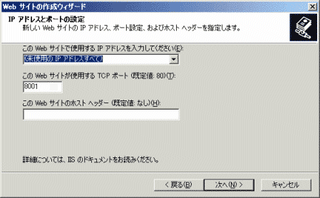 作業用の一時的なサイトのため実際に接続することはありませんが、ポートの重複を防ぐため、必ず利用していないポート番号(例:8001)を指定してください。 - ホームディレクトリのパスを指定する画面が表示されます。