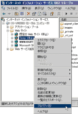 - 作成した更新作業用仮想サイト名「Temp」を選択し、メニューバーより[操作]→[プロパティ]をクリックします。