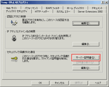 - [Tempのプロパティ]が表示されます。[ディレクトリセキュリティ]タブをクリックし、[サーバ証明書]をクリックします。