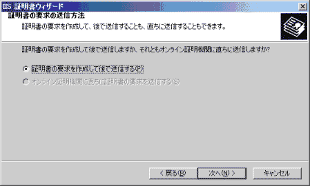 「証明書の新規作成」をクリックし、「次へ」をクリックします。 - 要求の送信方法を選択する画面が表示されます。 [次へ]をクリックします。