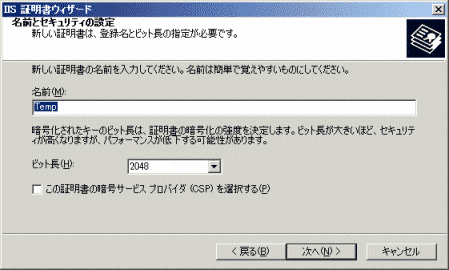 - 証明書の登録名を入力し、公開鍵のビット長(鍵長)に 2048 を選択後、[次へ]をクリックします。